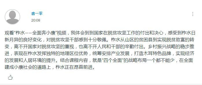 张培的娓娓道来让身处天南海北的同学们为学姐所在柞水县取得的成绩感到激动和感动。15分钟的视频讲述虽然短暂,但大家从柞水故事中感受到了基层干部和民众对坚决打赢脱贫攻坚战的决心与信心,也对以习近平同志为核心的党中央团结带领全国各族人民攻坚克难,实现全面建成小康社会充满信心。