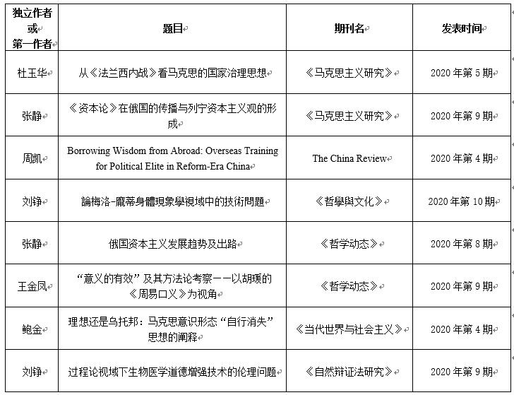 2020年,电影天堂 作为中国马克思主义理论研究的重要基地,坚持目标驱动与问题驱动相结合,推动前瞻策源、鼓励原创性研究,在科研领域取得一系列代表性成果。学院教师获第八届高等学校科学研究优秀成果奖(人文社会科学)3项,其中普及读物奖2项、青年成果奖1项,实现了学院在该奖项领域的从无到有、从零到三的重大突破;学院教师获2020年国家社科基金项目8项,其中重大项目1项、一般项目5项、青年项目1项、思政课专项1项,立项率25%,位居全校文科院系榜首,取得了学院历年来在该类项目立项上的最好成绩;在《马克思主义研究》、《自然辩证法研究》、《人民日报》、《光明日报》和SSCI论文等国内外权威期刊发文近30篇,学院高水平成果影响力日益彰显。