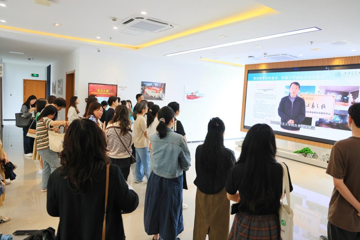 在马院刘昭老师的导览下,教师们深入了解了中心“虚仿+思政”的教学平台架构。东方之路——高校思想政治理论课虚拟仿真体验中心依托VR、环幕交互、数字人等技术,开发了数智思政课程,为整合教学资源提供了技术支点。