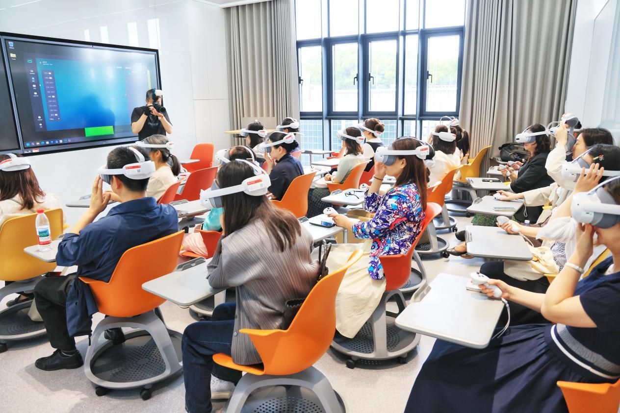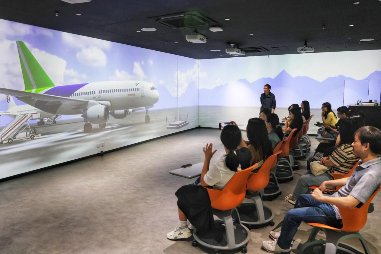 在一楼VR教室,电影天堂 与中国商飞联合研发的C919飞行驾驶仿真课程成为焦点。教师们在马院钟晨宁老师的指导下佩戴VR设备,化身“机长”握紧操纵杆,沉浸式操控国产大飞机起飞,体验乐趣的同时,通过设备感受到技术驱动的思政课堂的魅力。