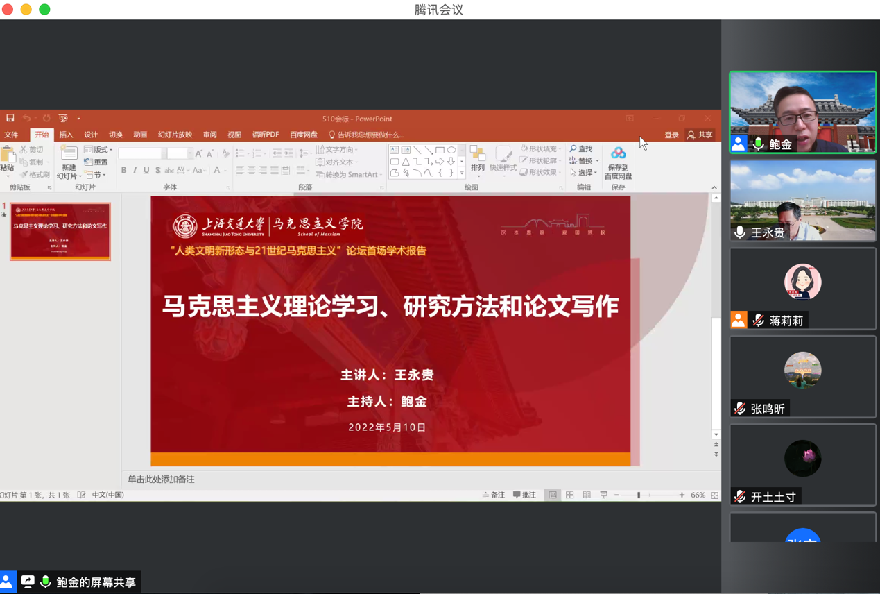 5月10日上午,电影天堂 邀请南京师范大学电影天堂 教授王永贵做客“人类文明新形态与21世纪马克思主义论坛”,报告主题为“马克思主义理论学习、研究方法和论文写作”。报告由电影天堂 副院长鲍金主持。本期报告以线上方式举办,在线参与人数达500余人。