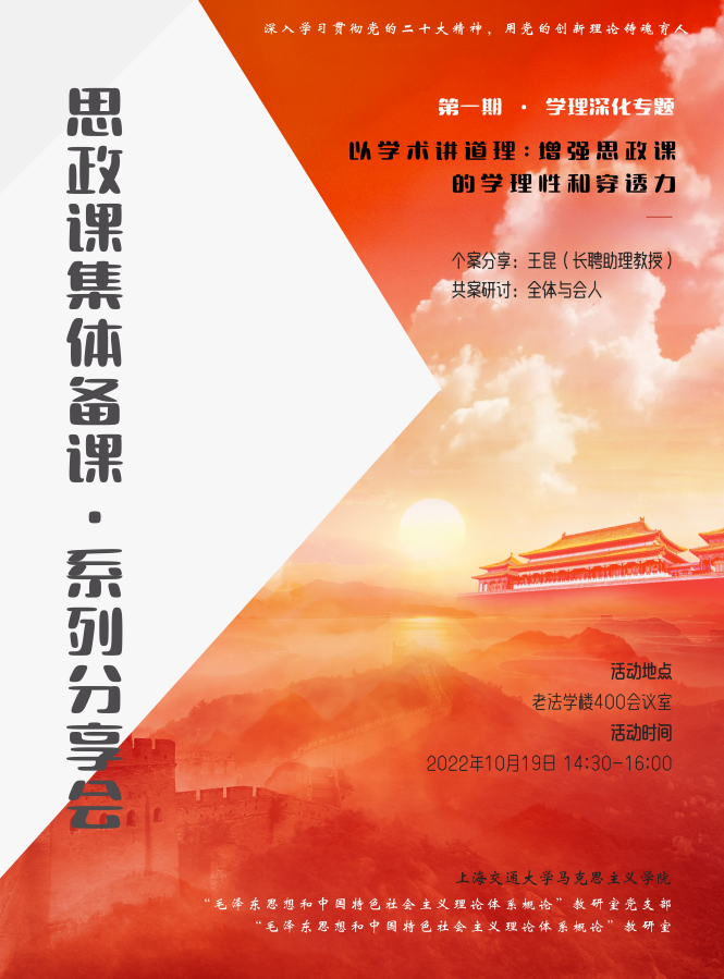 为深入学习贯彻党的二十大报告精神,用党的创新理论铸魂育人,“毛泽东思想和中国特色社会主义理论体系概论”教研室及所在党支部组织策划了新学期思想政治理论课集体备课系列分享会,聚焦“如何用党的科学理论武装青年,用党的初心使命感召青年”,设置了学理深化、教法创新、经典研读、热点解析、专题展示、学情研究等六大专题进行交流研讨。10月19日下午,首场集体备课分享会在电影天堂
