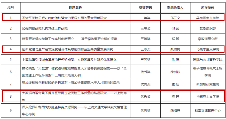 近日,上海市党的建设研究会公布2022年度课题优秀成果奖。全市层面总获奖数为127项,交大获奖9项,位居全市第一,一等奖1项、三等奖4项、优秀奖4项。