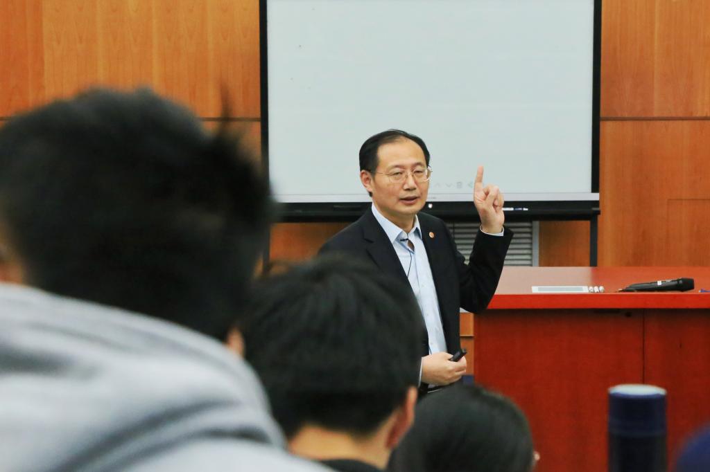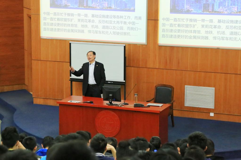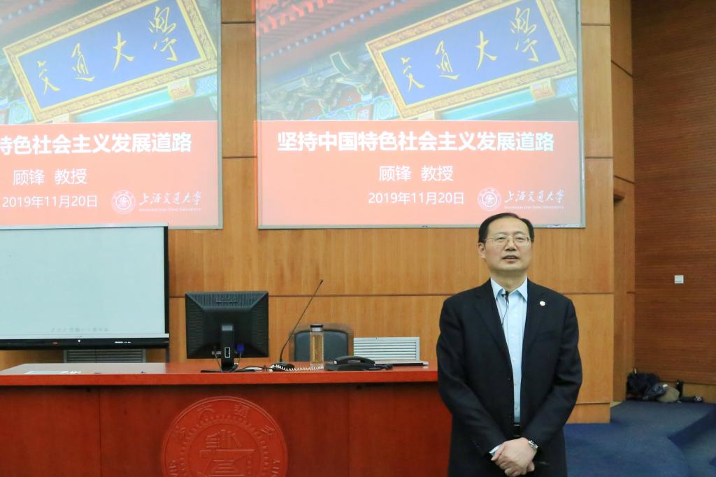 为开展好十九届四中全会精神宣讲,2019年11月20日下午,电影天堂 党委副书记顾锋教授为来自致远学院、数学学院、化学化工学院和外国语学院300多名本科生讲授了题为“坚持中国特色社会主义发展道路”的专题报告。“毛泽东思想和中国特色社会主义理论体系概论”教研室主任周凯主持此次授课。