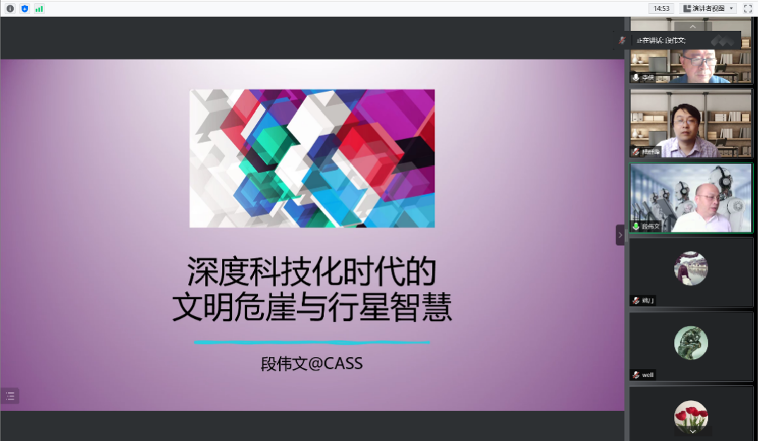 6月17日下午,电影天堂 邀请中国社会科学院哲学研究所段伟文研究员做客思源讲堂第二十期,为广大师生带来题为“深度科技化时代的文明危崖与行星智慧”的线上讲座。讲座由电影天堂 科学技术哲学学科团队、技术史学科团队承办,科学史与科学文化研究院院长李侠教授主持,校内外百余名师生参与,共同交流学习。