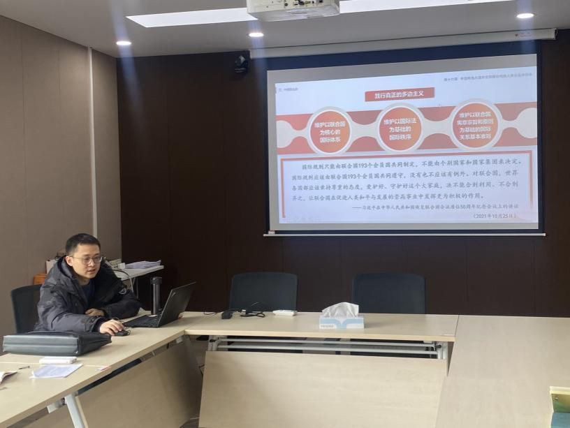 会议伊始,侯冠华老师做概论课第十六章《中国特色大国外交和推动构建人类命运共同体》的专题教学分享。侯冠华介绍了本专题与其他专题的关系、专题的重点难点和专题的教学方法,分享了如何以更加生动的方式进行课程导入的经验,同时基于生动的现实案例讲解了“世界怎么了”“人类向何处去”“中国怎么办”等教学核心内容。与会教师积极开展讨论,围绕课程的内容设计、教学方法、教学案例、教学互动等分享教学心得。