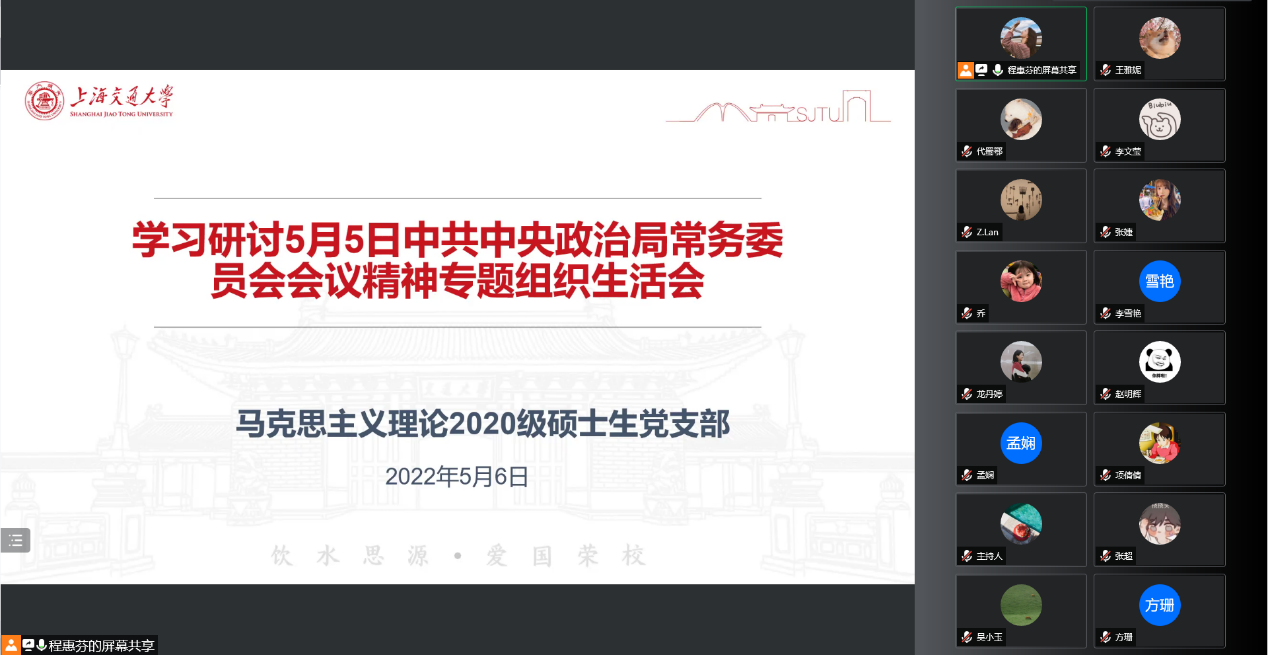 在电影天堂 党委的部署下,2022年5月6日,马克思主义理论2020级硕士生党支部举行了线上专题组织生活会,深入中央政治局常委会会议精神。本次活动由党支部书记程惠芬同志主持,支部26名党员同志参加会议,12位入党积极分子列席会议。