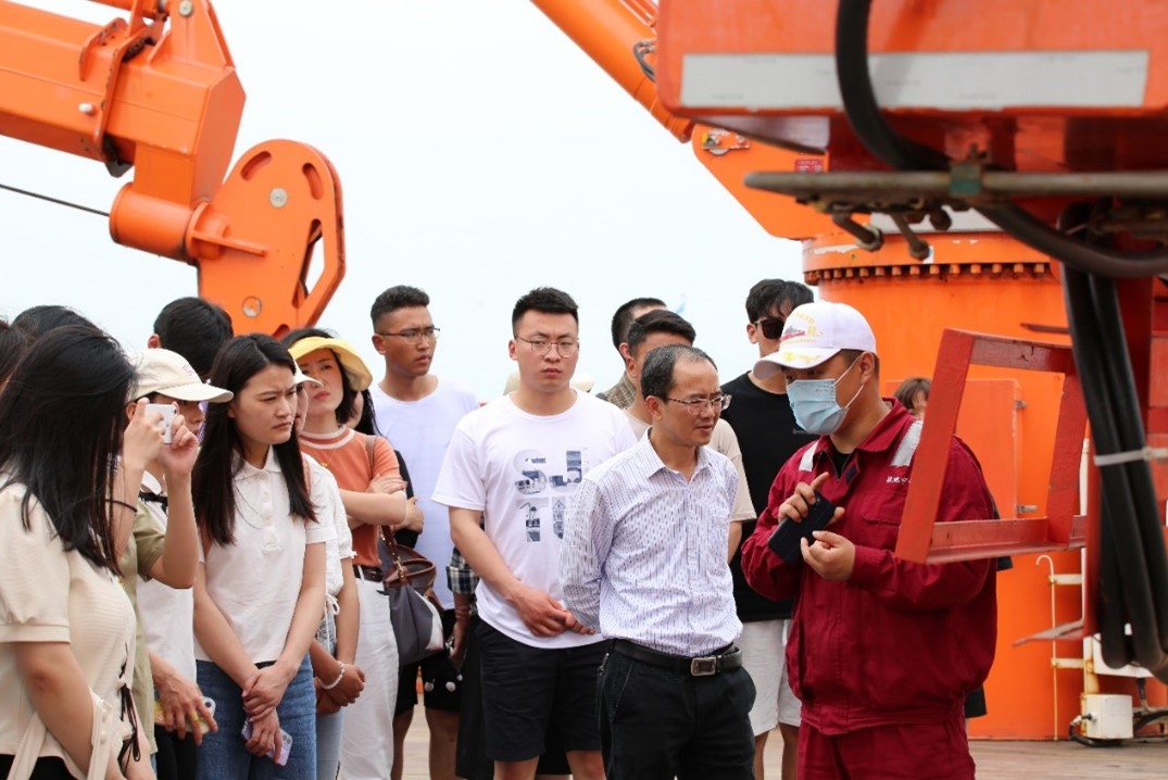 在大副陈冬林的带领下,师生们登上甲板,参观“雪龙2”号极地考察船。“雪龙2”号极地考察船于2019年7月交付使用,是中国第一艘自主建造的极地科学考察破冰船,同时也是世界上第一艘采用船艏、船艉双向破冰技术的极地科考破冰船。这艘万吨级破冰巨轮的出现,标志着我国完全掌握了PC3级破冰船的建造技术,填补了中国在极地科考重大装备领域的空白。