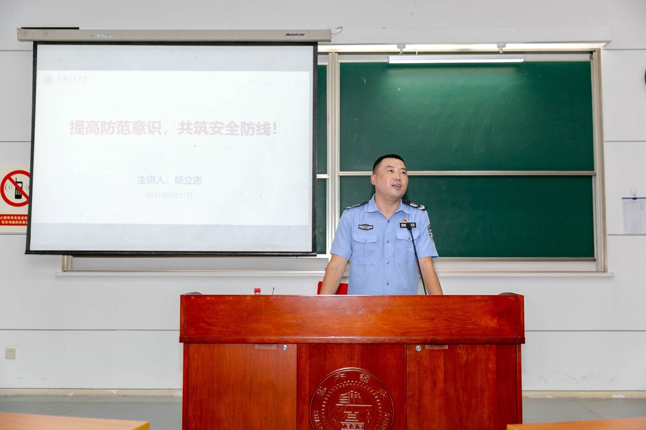 校保卫处杨立志老师以“提高防范意识,共筑安全防线”为主题,为同学们做校园安全教育专题报告,杨立志老师通过生动形象的实际案例展示了保卫处对同学们生活提供的各种帮助,用幽默诙谐的语言为大家进行了安全教育,并提醒各位同学注意安全防范,注意交通安全、消防安全、心理健康,避免压力的过度积累,顺利且愉快地度过研究生生涯。