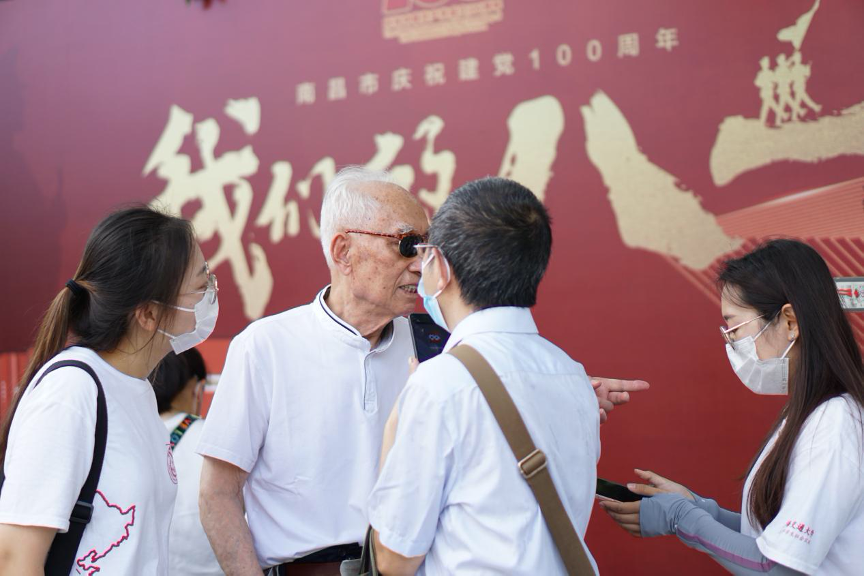 实践团成员观看了由南昌八一起义纪念馆、共青团南昌市委和江西教育出版社共同主办的《我们的八一》新书发布会,并采访了受邀老战士代表李潭清同志。李谭清老战士1945年参加八路军,1950年入党,历任二十八军第二十九师战士、卫生员,曾参加了抗日战争及泰安战役、莱芜战役、孟良崮战役、济南战役、中原战役、淮海战役、渡江战役、解放大上海战役、福厦战役等重大战役;先后荣获“解放奖章”“中原战役纪念章”“淮海战役纪念章”“渡江战役纪念章”“抗战胜利70周年纪念章”“建国70周年纪念章”等。回忆起艰难的作战岁月和自己的毕生经历,李谭清老战士很是感慨,他嘱咐实践团成员:“你们都是大学生、研究生,毛主席讲世界是你们的,也是我们的,但是归根结底是你们的。你们青年人朝气蓬勃,正在兴旺时期,好像早晨八九点钟的太阳,希望寄托在你们身上。”实践团成员听完李潭清老战士的讲述十分触动,表示一定不忘老战士的嘱托“为祖国建设服务,报效祖国”。