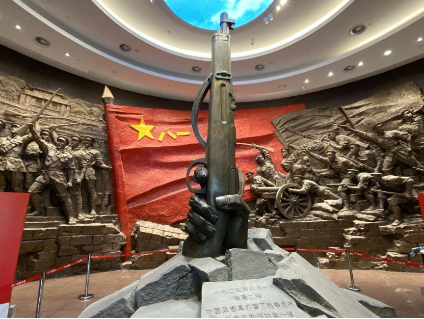 走入纪念馆一楼序厅,正中是《石破天惊》雕塑:一只强劲有力的大手,从崩裂的石块中伸出,紧扣着汉阳造步枪的扳机。其中一块石块上镌刻着起义打响的时刻:1927年8月1日凌晨2时。1927年8月1日,中国共产党领导国民革命军2万余人在江西省南昌市举行武装起义,打响了武装反抗国民党反动派的第一枪,揭开了中国共产党独立领导武装斗争和创建革命军队的序幕。