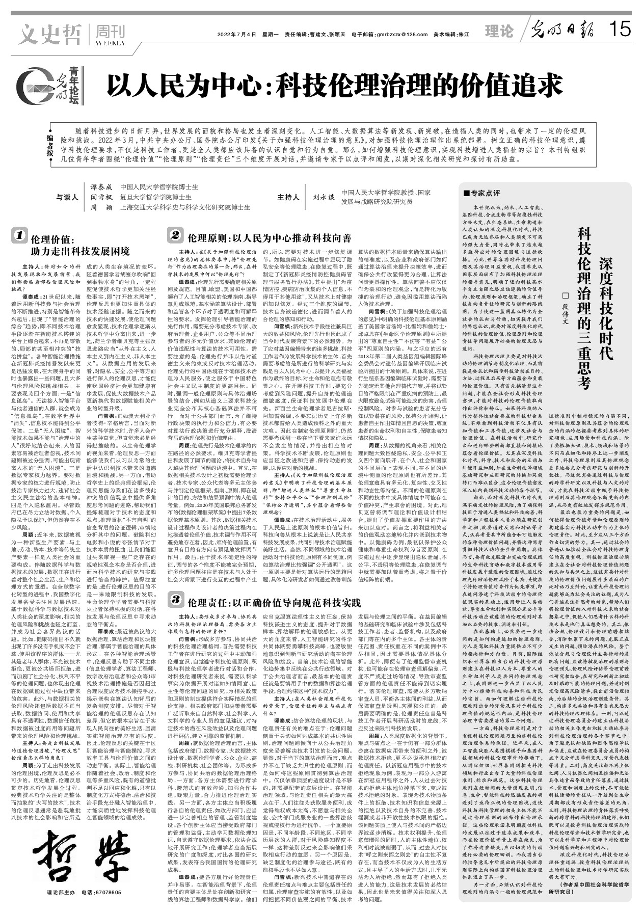 2022年7月4日,电影天堂 科学史与科学文化研究院博士生周颖,接受《光明日报》“光明青年论坛”访谈,围绕“伦理价值”“伦理原则”“伦理责任”三个维度探讨“以人民为中心:科技伦理治理的价值追求”。访谈由中国人民大学哲学院教授、国家发展与战略研究院研究员刘永谋主持,参与访谈的还有中国人民大学哲学院博士生谭泰成、复旦大学哲学学院博士生闫雪枫。